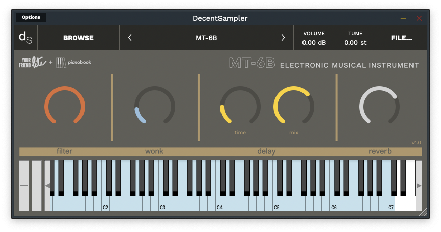 I’ve included a filter control along with knobs for wonk, delay and reverb. I recommend mapping each of these to a midi controller and playing around. I find this instrument works well for slow spaced out atonal melodies. There’s a some randomisation going on so you should get some interesting subtle shifts in tone.